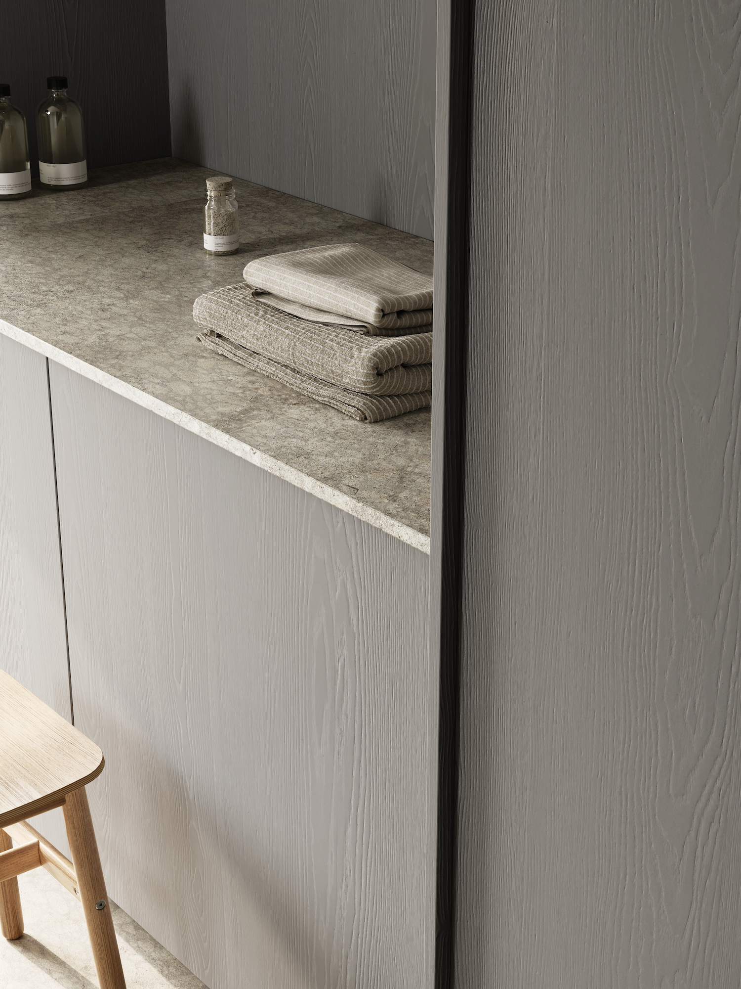 KIVI is a light creamy grey décor with a brushed matt finish and subtle woodgrain feature.