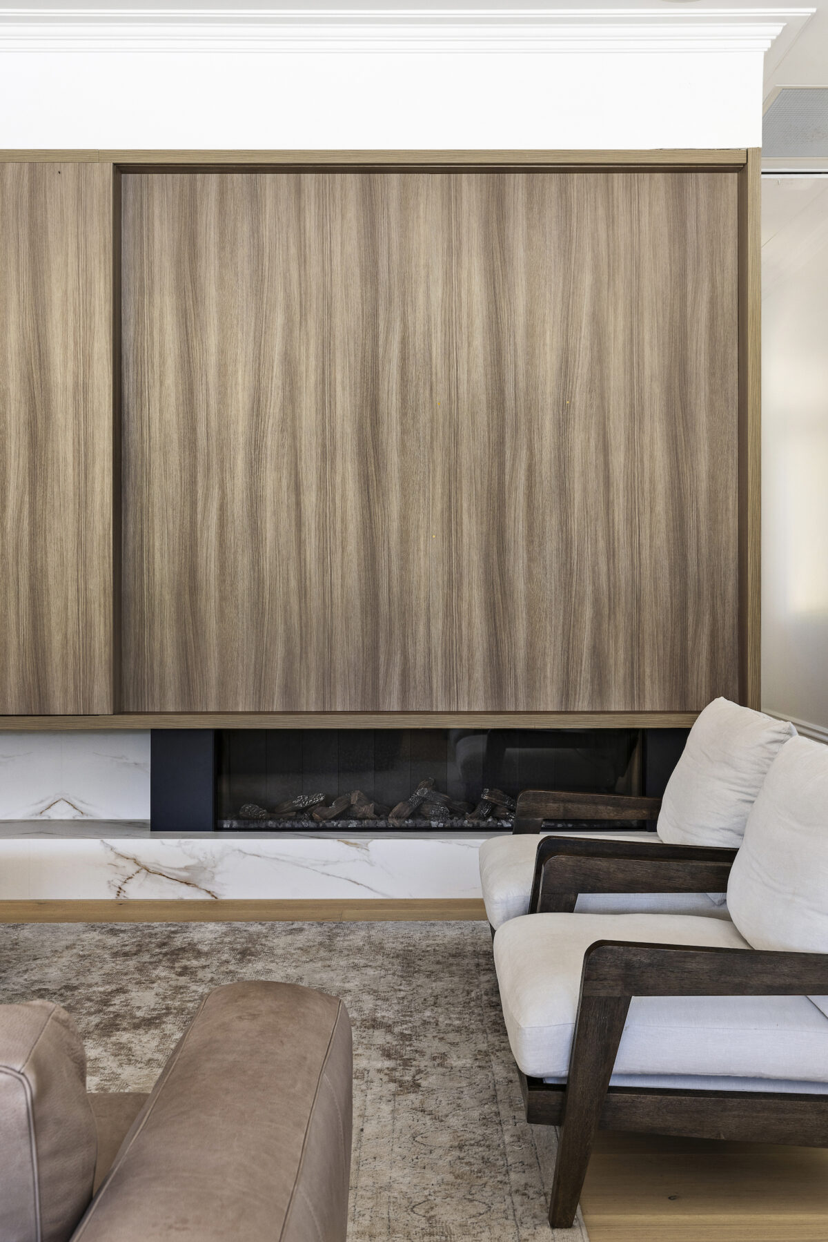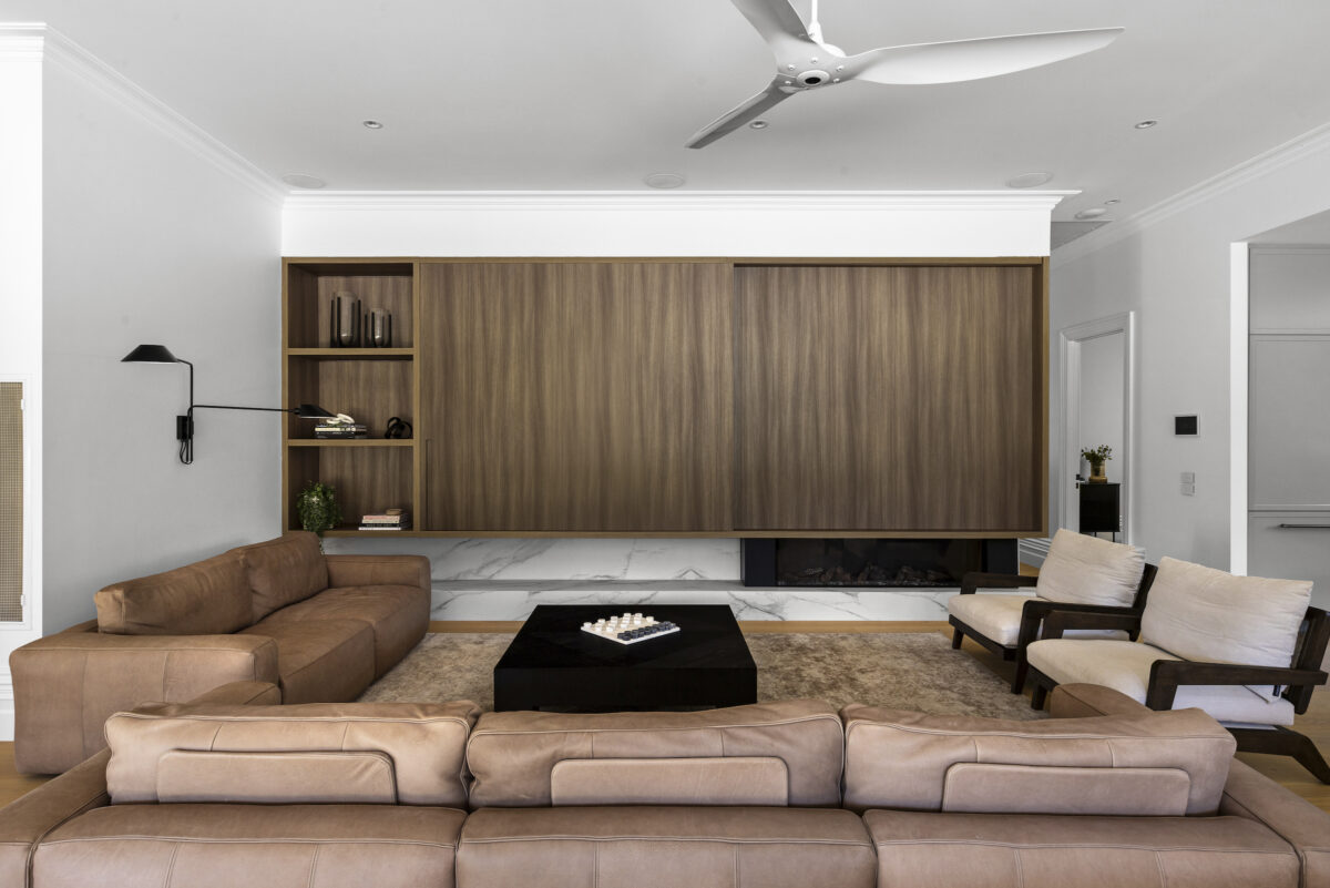 Designed by Vision Design Studio the living room at Clarendon Eyre balances practical design with considered charm. Finished in Lignapal 181.05 Spotted Gum, a hidden TV integrated into the joinery keeps the space centered on connection and quiet luxury.
